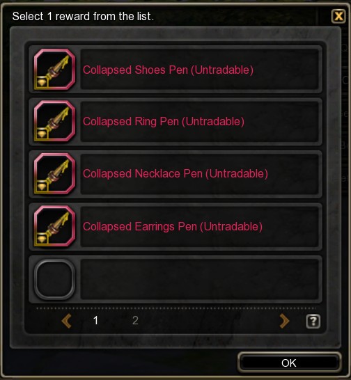 (ie. Purchsaing 1 Collapsed Necklace Engraving Package (100+10) and 2 Collapsed Earrings Engraving Package (100+10) will add up to 3 packages in total and will be rewarded with 1 Collapsed Engraving Pen Selection Box(Untradeable))